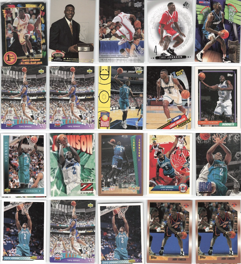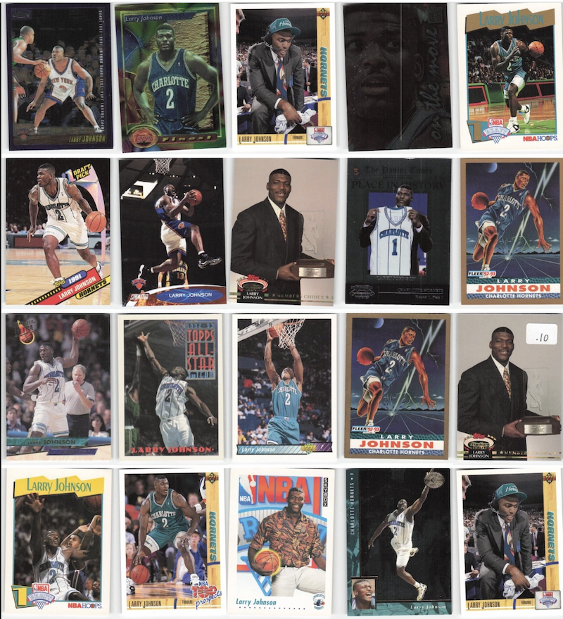 Here is my Larry Johnson card collection. My good friend, Luke, in middle school and I were fans of the Charlotte Hornets. He was an Alonzo Mourning fan and I as you can tell was a Larry Johnson fan. He and I would trade each other cards. Whenever I got a Zo card I would trade for any Larry Johnson cards. We had jerseys of them which we would play in anytime we were outside playing basketball in the neighborhood. Those were the days! Now, my kids started getting into cards. I dusted off my collection and showed my kids that dad was just like them when I was their age. The really enjoyed looking at cards from the 90s. Thank you for letting me share my story.